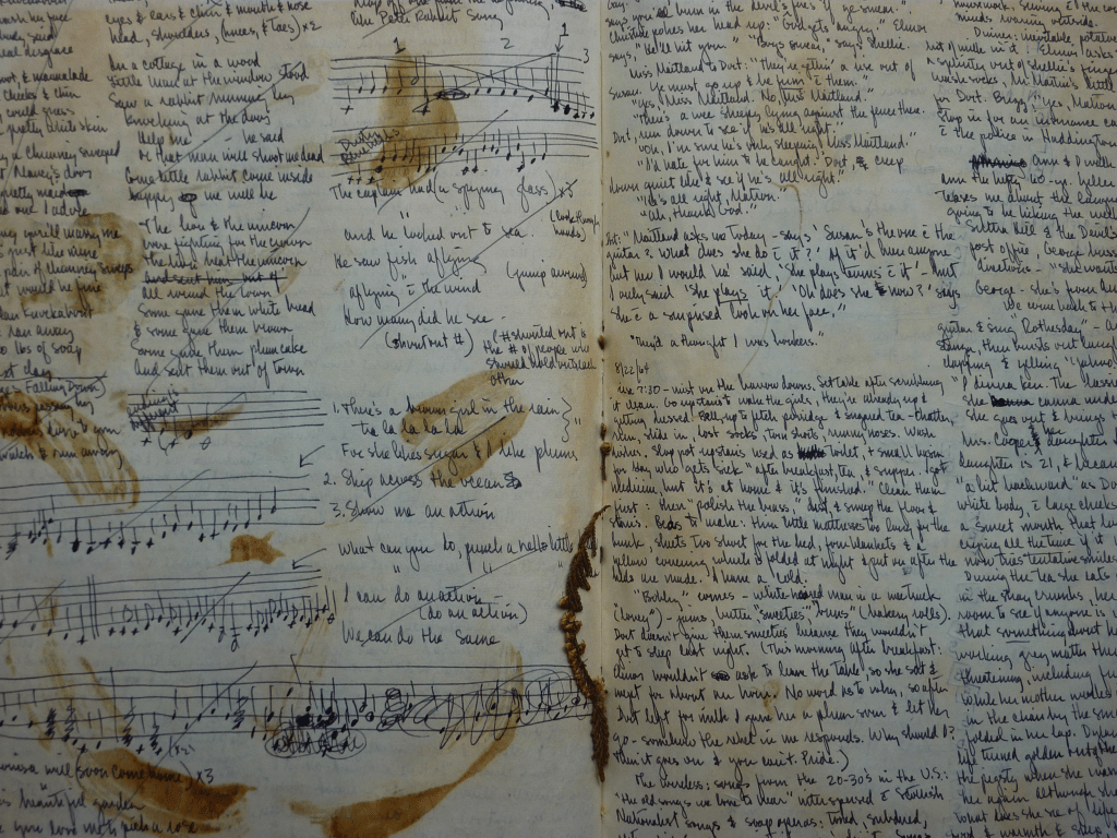 A page from Sue Parman’s 1964 journal when she was working on “A Song for J.R.R. Tolkien.” As writers, it is helpful to have places where you can mess around with ideas. Sue, who was 18 years old at the time, was working out music to go with Tolkien’s Elvish poetry. Tollkien, author of The Hobbit and Lord of the Rings, often combined drawings and maps with writing in sketchbooks.